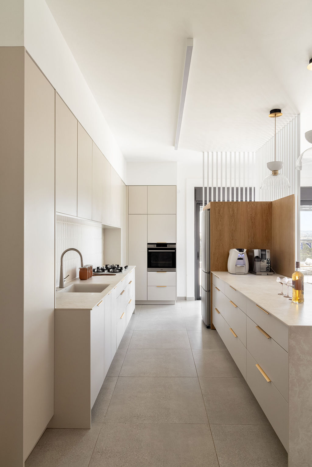 אחת מהמשימות המרכזיות בפרויקט הייתה תכנון מוקפד של פתרונות אחסון חכמים, כולל טיפול באתגר לא פשוט: מיקום המקרר במרכז החלל הציבורי. פתרנו זאת באמצעות נגרות מותאמת אישית שמטשטשת את הנוכחות שלו ומשתלבת בהרמוניה עם המטבח והחלל הכללי.